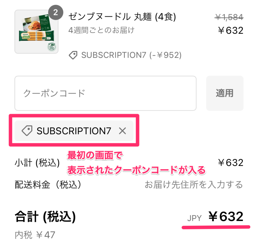 ヌードル2袋をそのまま選べば、最初の画面で取得したクーポンコードで適用されます。