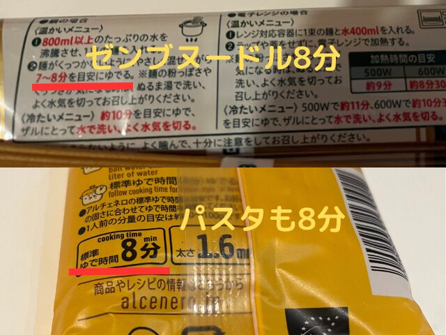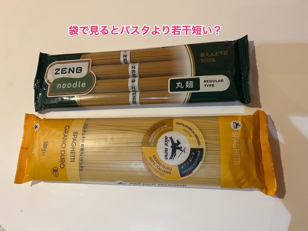 パスタの袋とゼンブヌードルを並べてみた時は、若干ゼンブヌードルのほうが短いのかなと思いましたが、
