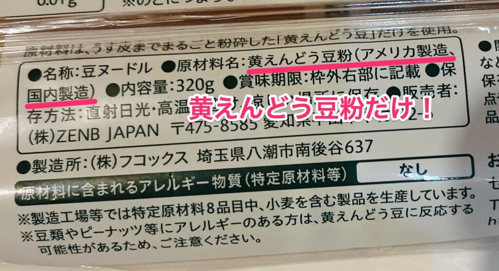 そのうたい文句の通り、原材料見ると黄えんどう豆粉しか書いていません。
