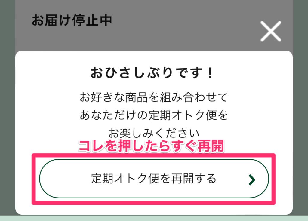 マイページのトップにある、「定期オトク便を再開する」をタップします。