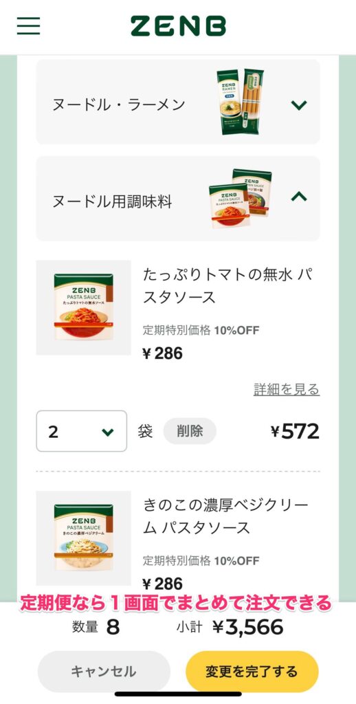 ゼンブヌードルの定期便の注文内容と配送間隔は最初は固定