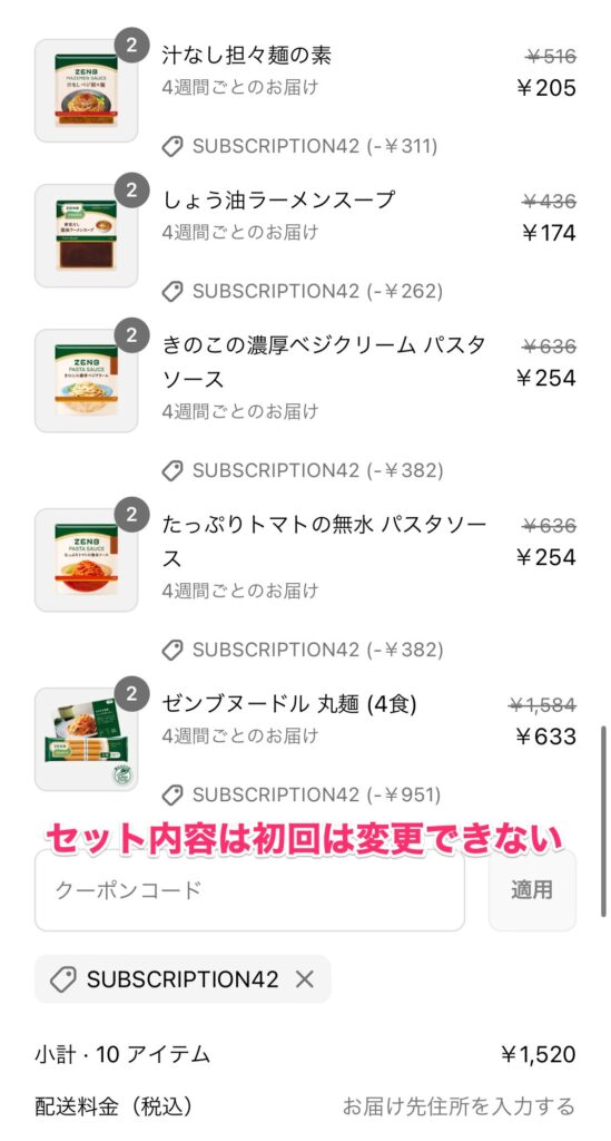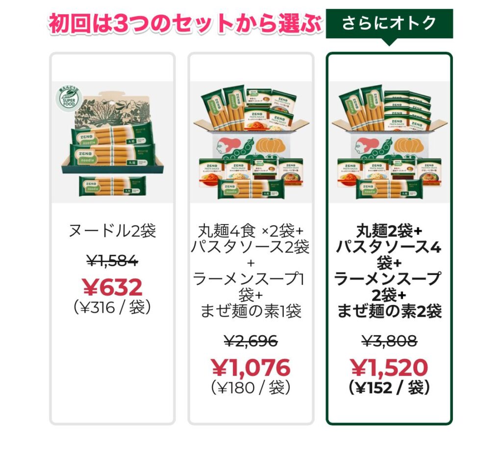ゼンブヌードル、定期便の最初は、60%割引のセットがあるんですが、セット内容は、初回では変えられないようになっています。