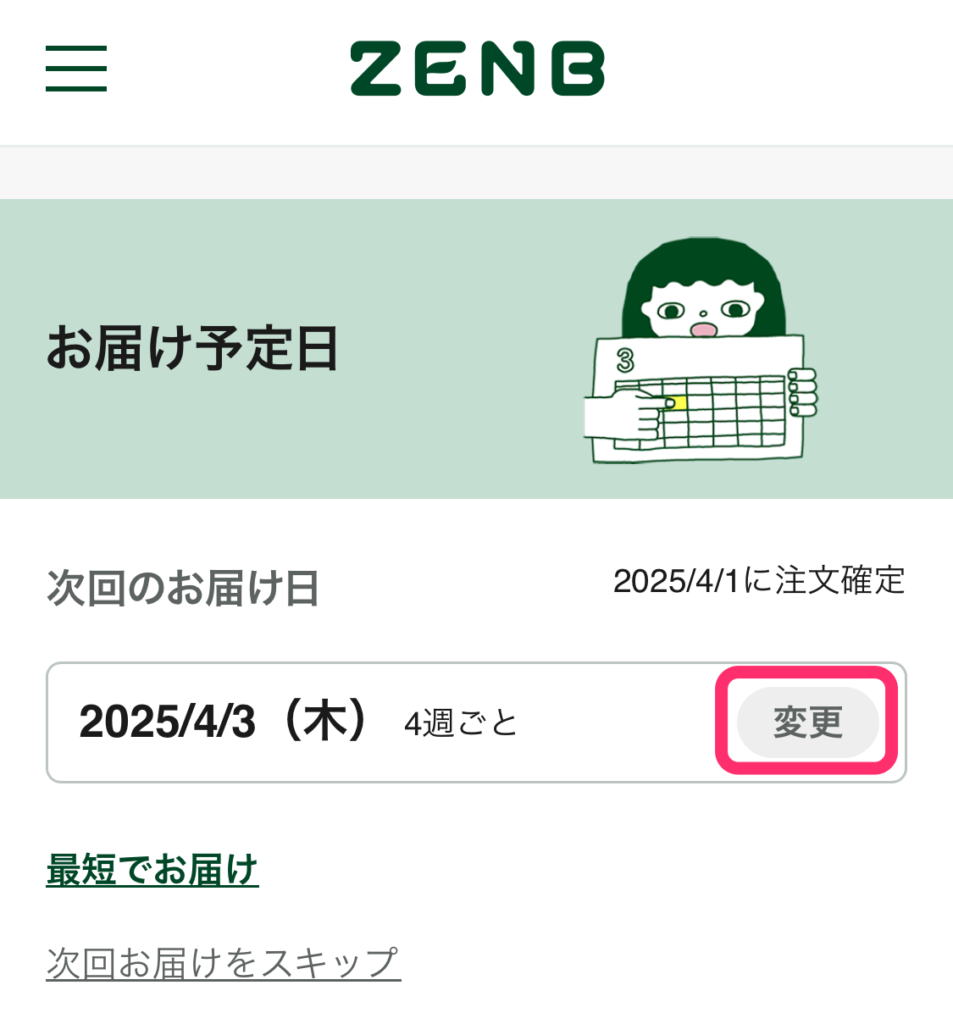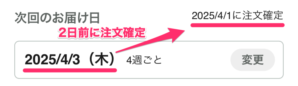スキップをした後は、変更後の注文予定日になるのですが、