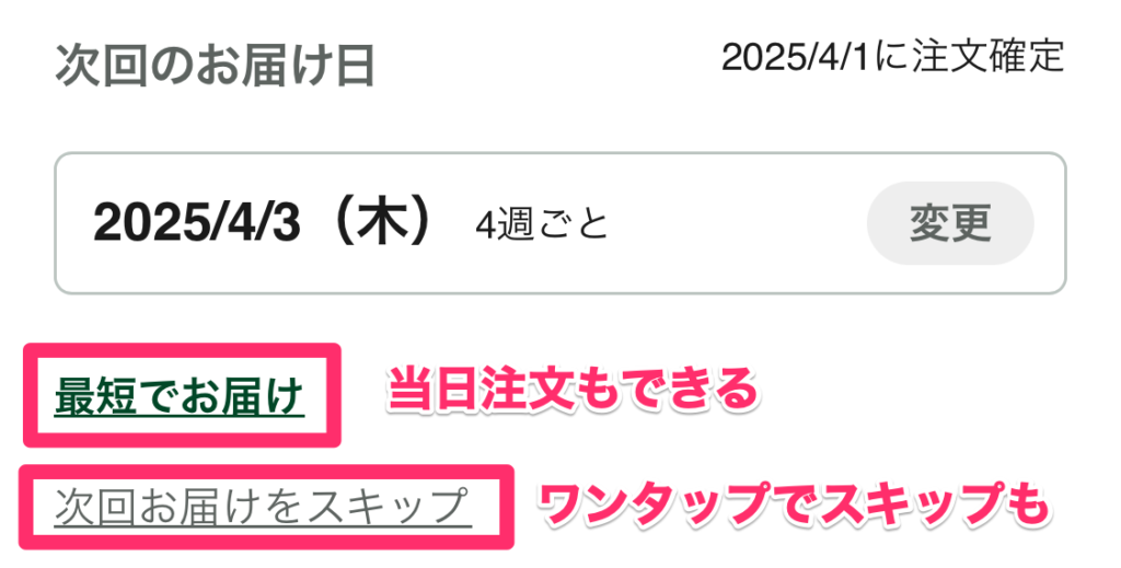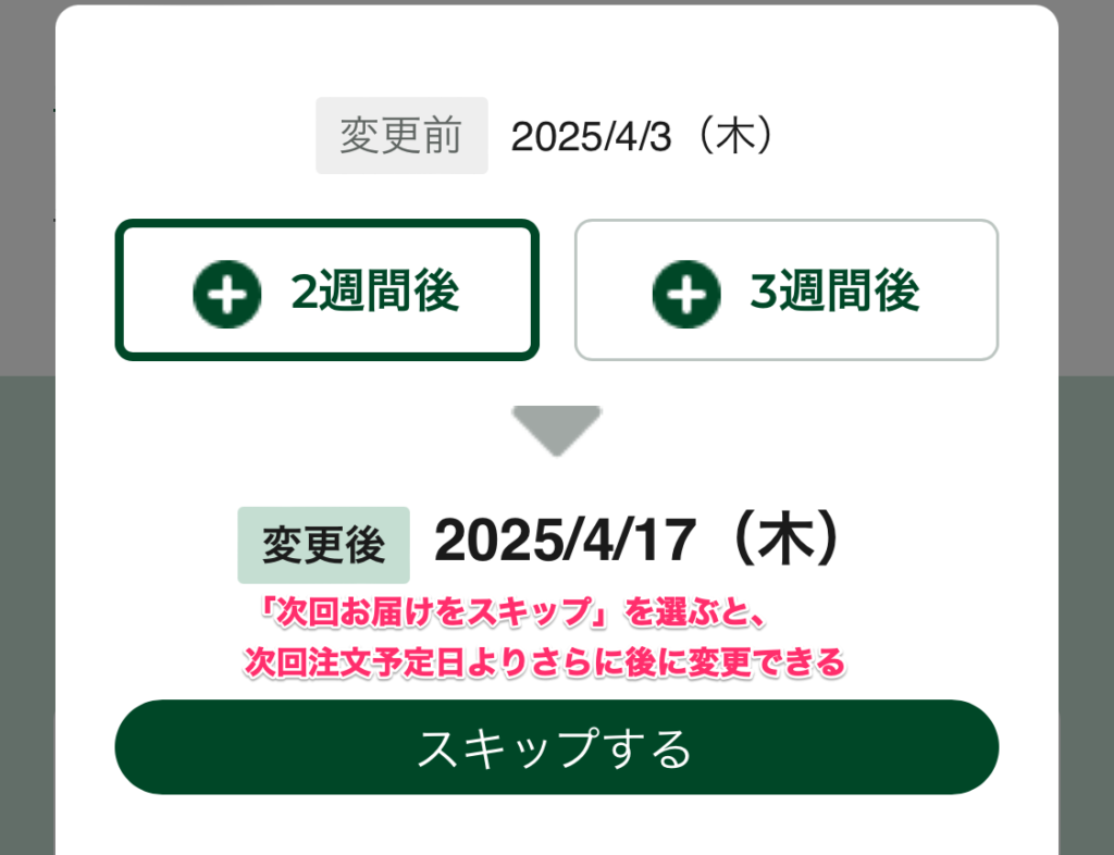 逆に、もう少し先がいいなという時は「次回お届けをスキップ」を押せば、さらに先延ばしにすることもできますよ。