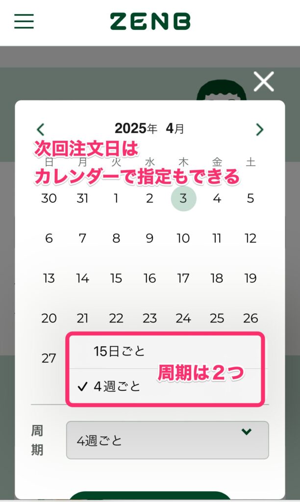 マイページでは、お届け間隔を「15日ごと」または「4週間ごと」のいずれかで選べるのですが、