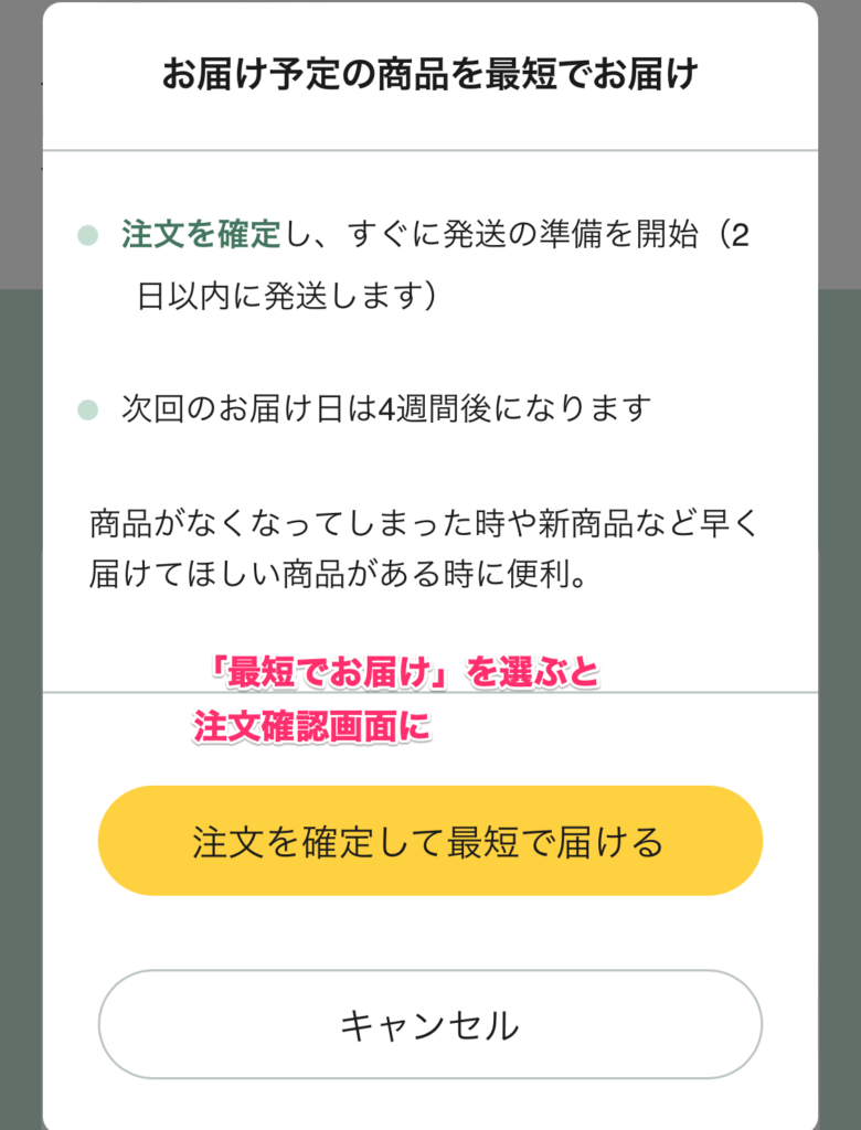 また、次の注文日を待たず、すぐに注文したい場合は「最短でお届け」というところを押すと、その場で定期便の注文ができます(下の図で見れます)。