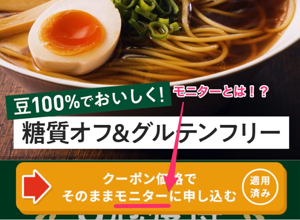 ゼンブヌードル、買おっかなーと思って購入ページに行こうとしたら、モニターっていう文字を見つけたんですよ。